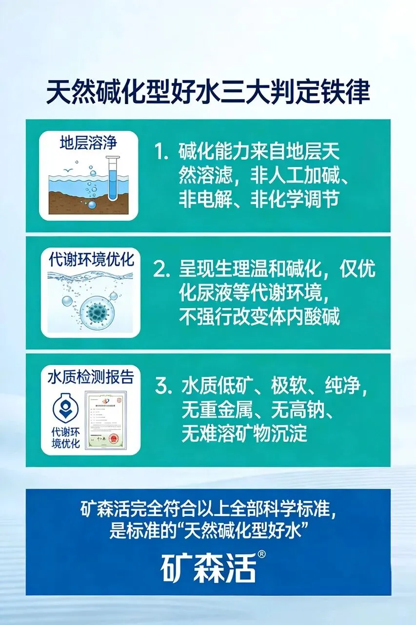 本文严格遵循饮用水化学、人体生理学、水文地质学标准,无夸大、无伪科学,清晰定义「天然碱化型好水」,并深度论证矿森活为何属于此类优质饮用水。