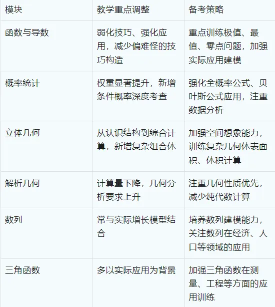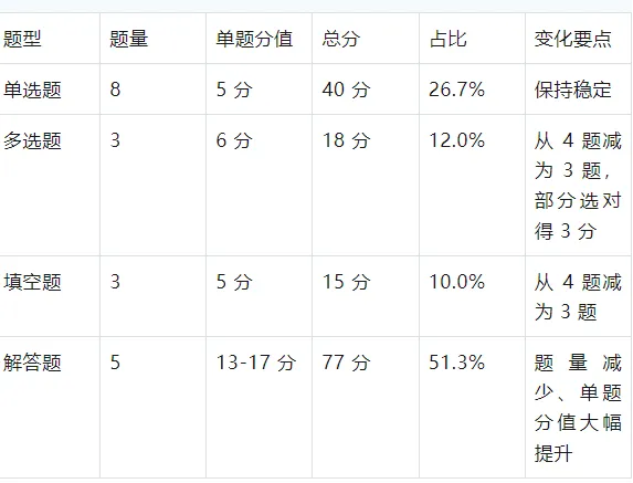 解答题改革:这是试卷结构变化最大的部分。解答题从 6 题减为 5 题,但总分从 70 分提升至 77 分,单题分值大幅提升,压轴题可达 17 分。这种变化要求学生必须书写完整的思维过程,不能再依靠 "跳步" 得分。