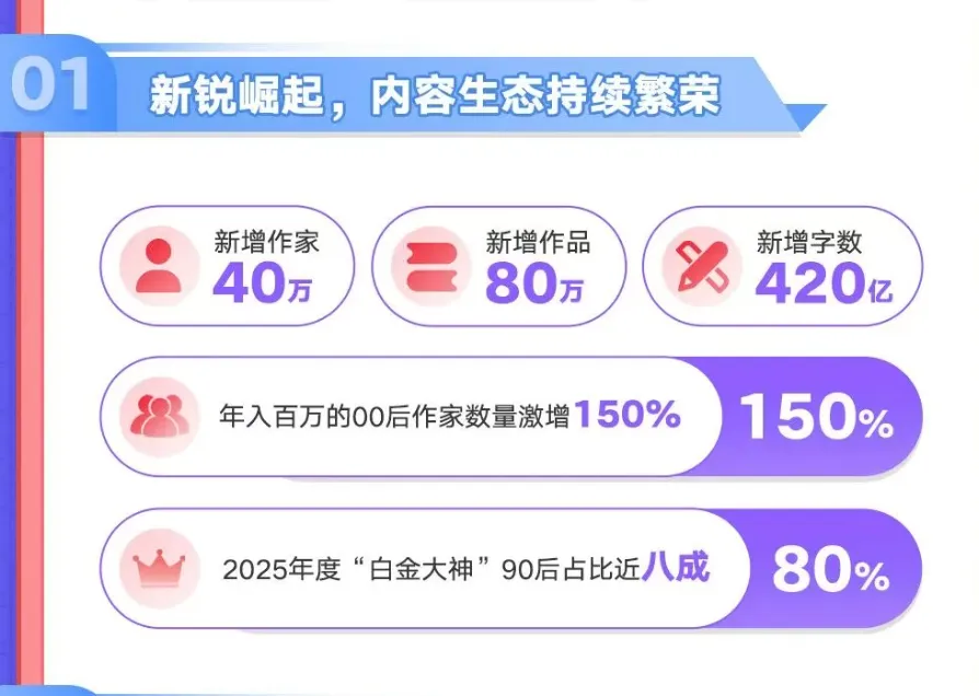 极速省流版:阅文免费战略失败,付费微跌,网文未完,可冲!经常上龙空的兄弟都知道,在龙空,有一类每日贴,那就是网文要完,起点要完,小说已经步入寒冬……而自ai兴起后,则有多了一类帖子,ai取代作者,彻底杀死小说行业。针对起点,还一类帖子则是质疑起点不开免费,认为番茄将一统天下。但是,四面楚歌的前提下,阅文的在线业务收入仍然坚挺,40.470亿元在线业务傲视群雄,其中自由平台就贡献了35.623亿元。这里介绍一下,阅文的自有平台主要为起点中文网、起点女生网、QQ阅读,创世中文网、云起书院、潇湘书院、 言情小说吧、红袖添香、小说阅读网、元气阅读等。要知道,在字节烧钱,番茄野蛮扩圈之后,行业流量红利见顶,用户注意力被短剧,短视频,游戏持续分流,加之经济下行,大环境不好,阅文仍然保持住了业务。(PS。虽然但是,我还是觉得这财报写的挺那个的,【专注提升核心产品运营】?一整年搞那么多离谱操作,运营在哪?少搞点幺蛾子就万事大吉了)另外,有一点很反直觉的是,在免费阅读渠道用户规模收缩的大背景下,阅文仍旧保持了稳定的用户数量。(PS。也许这就是新的产品经理不敢轻动用户等级的原因)根据财报数据显示,2025 年阅文自有平台产品月活跃用户稳定在 1.041 亿,与 2024 年的 1.038 亿相比较实现了增长。而在这 1.041 亿月活当中,平均月付费用户稳定在900万,仅仅比2024年统计的平均月付费用户910万少了10万。这个意思大概就是指q阅那边一分钱读整本书的活动,这一类是不计算在付费业务当中的。当然,从阅文公众号发布的财报宣传图02中就能看出,列的四项中有三项都是起点的统计指标,可见起点在阅文中的地位。并且,由于【追更】这种行为的存在,起点也拥有着业内罕见的巨量现金流。同时,从途中可以看到,阅文收缩了渠道分发,导致腾讯那边的渠道减少了近3000万月活。阅文这个大家庭,某种意义上真就靠着起点这头现金大奶牛。不过令人唏嘘的是,去掉腾讯那边的渠道,自有的付费平台月活有1亿多,但最后能付费的用户仍旧只有900万。偏偏就这900万付费用户数,造就了全网作者拿到稿费最高的平台。这也难怪起点这几年逐渐收紧防盗政策,毕竟一亿多的月活最后付费人数才900万,可谓是十不存一。我平时也会高强度在浏览器上搜索自己的书,我发现去年我可以在盗版网站上看到我一周前更新的章节,而今年再搜的时候我只能看到我两周前更新的章节,有时候还有乱码。(PS。网上常有人说起点防盗是一步昏招,降低了影响力,但对于我们这种小作者来说,真的很感激这条政策)由于我书一般都不设置粉丝值发言,有时候看到只订阅一章的读者指点江山,心情会十分复杂。我知道,我写到毒点了