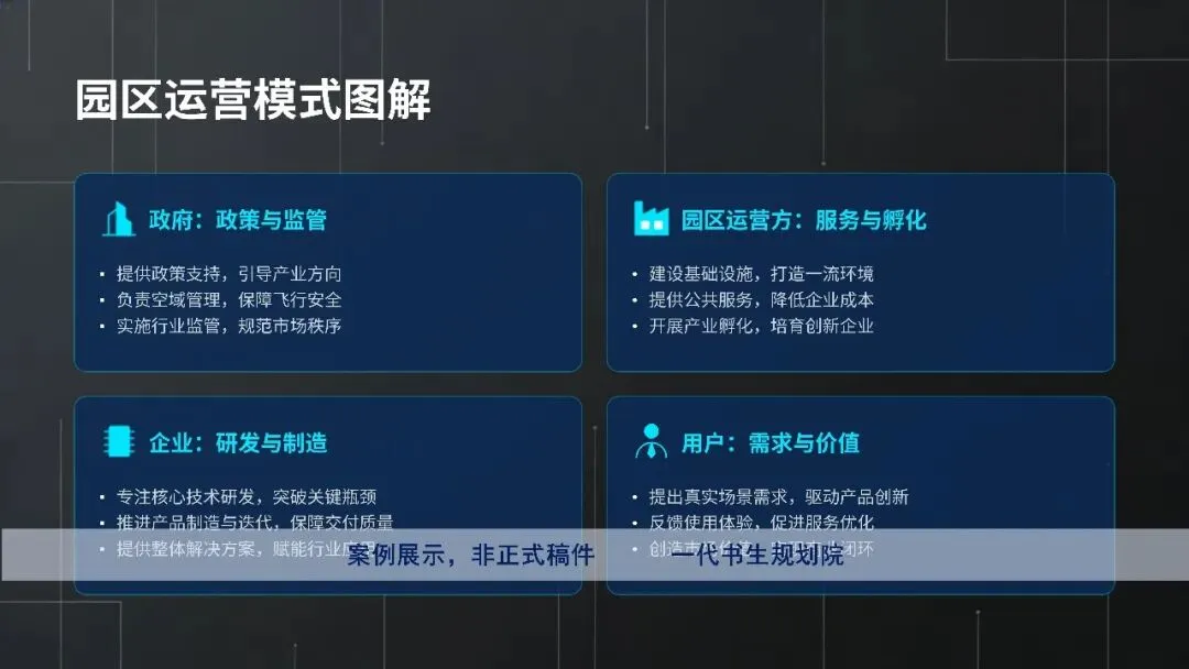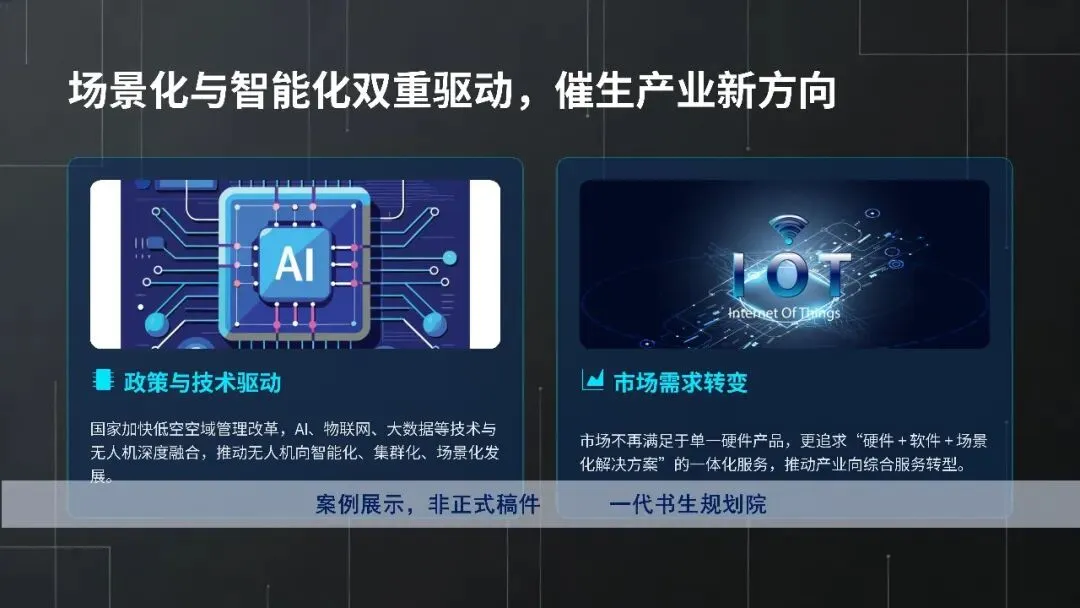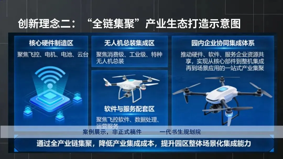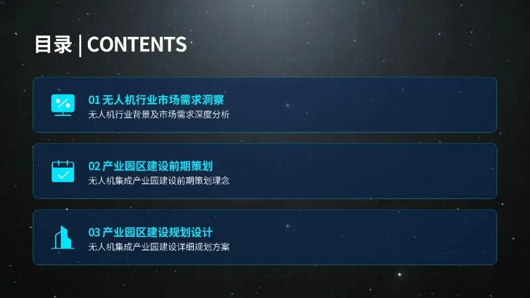 以下方案内容中,主要包含:无人机行业背景及市场需求洞察、无人机集成产业园建设前期策划、无人机集成产业园建设规划设计等内容。方案紧扣 “十五五” 低空经济发展要求,以场景化集成、全链集聚、一站式测试为核心,构建全链条无人机集成产业服务体系。