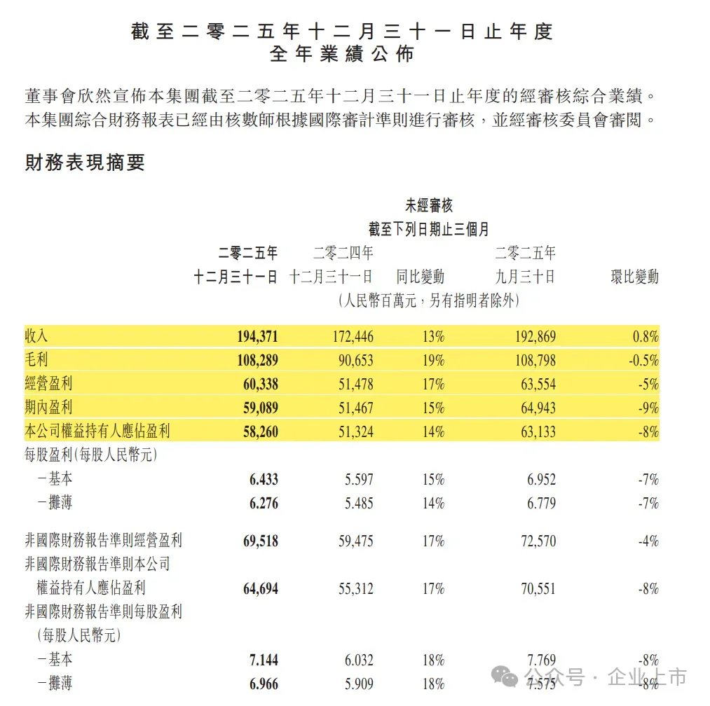 第四季度表现:在2025年最后三个月,收入为1944亿元人民币,同比增长13%;净利润为583亿元人民币,同比增长14%。虽然环比第三季度略有下降,但整体增长势头良好。
