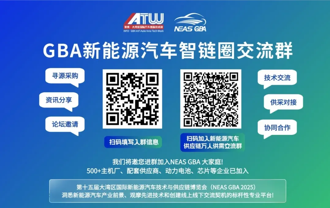 速进!专业技术交流·精准供采对接·最新资讯共享·独家活动邀请——你想要的这里都有!识别二维码找管理员入群,进入【GBA新能源汽车智链圈交流群】,欢迎主机厂、配套供应商、动力电池、芯片等企业加入!