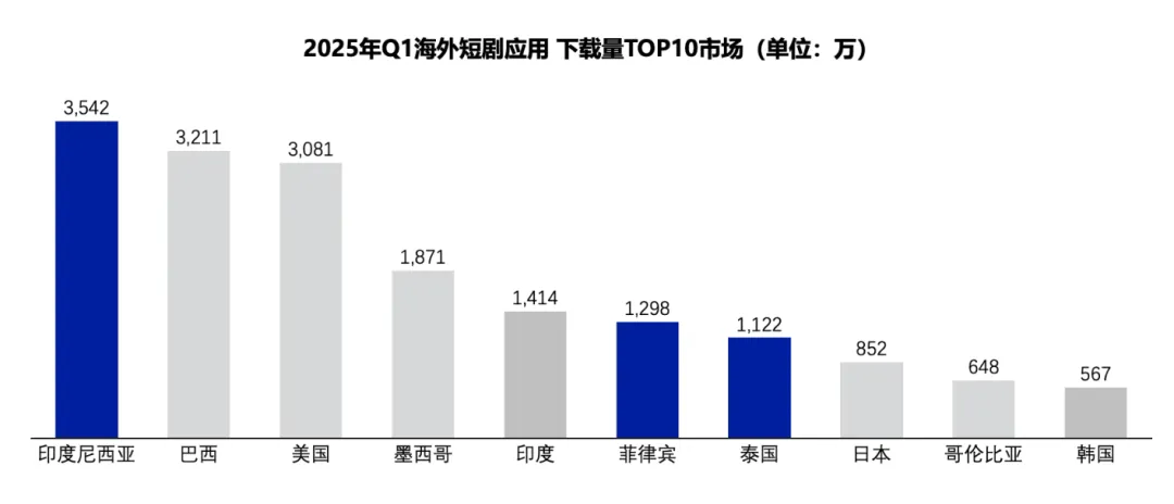 在全球范围内,东南亚地区已成为短剧应用下载量最大的区域市场。2024年,印度尼西亚以超过5000万次下载位居全球第二,仅次于美国;菲律宾、泰国和马来西亚等国家也进入全球下载量前十。2025年Q1,印度尼西亚以3542万次下载登顶全球第一,占据全球近13%的市场份额;菲律宾和泰国则分别以1298万次和1122万次排名第六和第七。