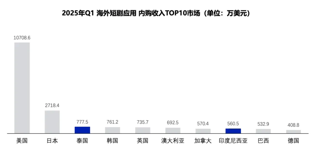 在收入方面,东南亚短剧市场的APP内购收入亦实现高速增长。2024年,印度尼西亚、泰国和马来西亚分别以1746万美元、1089万美元和1062万美元的年度累计收入,进入全球前十市场。到2025年Q1,泰国以778万美元跻身全球短剧应用内购市场前三,印度尼西亚则以561万美元排名第八。