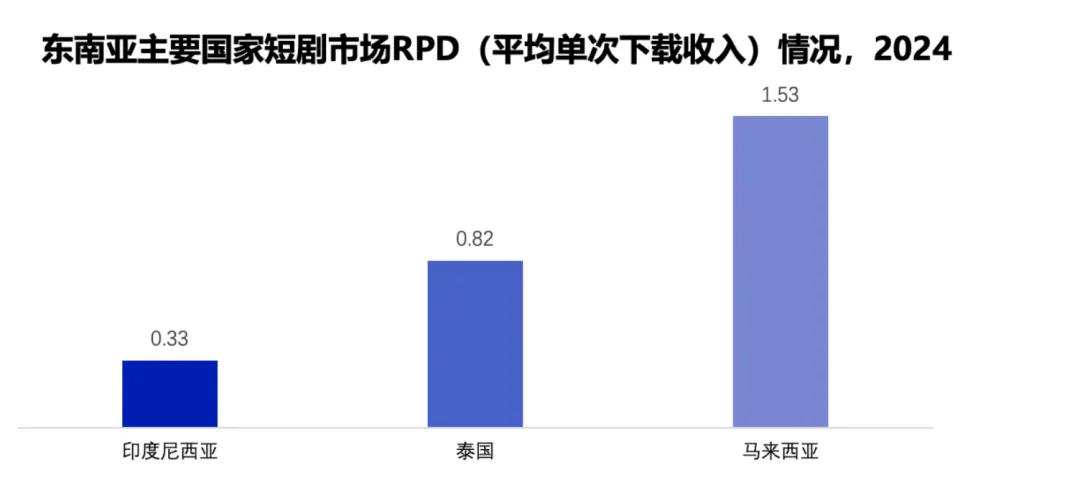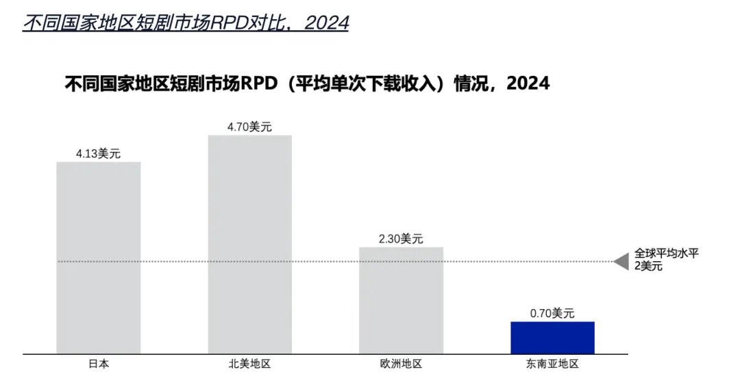 东南亚短剧市场正处于快速扩张的蓝海阶段,展现出极大的商业潜力。2024年,该地区短剧应用的下载量已位居全球首位,但内购收入和单次下载平均收入(RPD)远低于欧美成熟市场,表明市场尚未被充分开发,成长空间巨大。