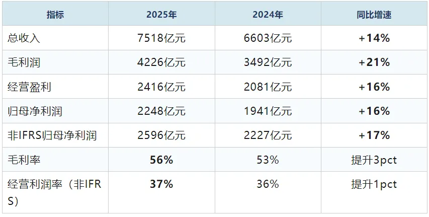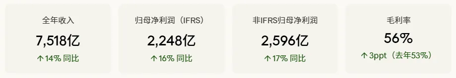 本公司权益持有人应占盈利。2025Q4的本公司权益持有人应占盈利同比增长14%至人民币583亿元。2025Q4的非国际财务报告准则本公司权益持有人应占盈利同比增长17%至人民币647亿元。