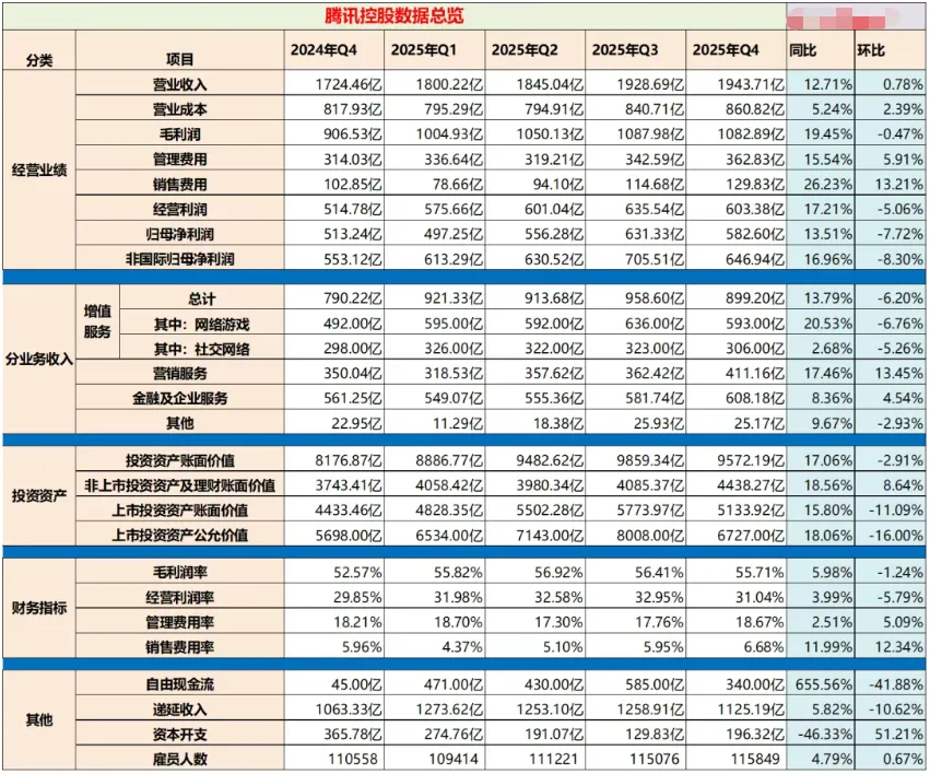 从季度表现来看,2025年第四季度实现营收1943.71亿元,同比增长13%,环比增长0.8%;经营利润603.38亿元,同比增17%,环比降5%。第四季度腾讯权益持有人应占盈利582.60亿元,同比增长14%,环比下降8%;整体期内盈利590.89亿元,同比增15%,环比降9%。