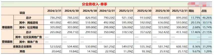 增值服务是腾讯最大的收入来源,2025年收入同比增长16%至3,693亿元,包含本土游戏、国际游戏和社交网络三大板块。