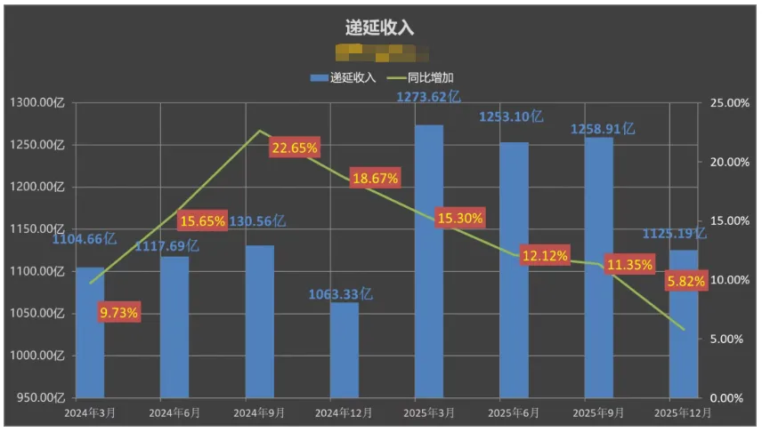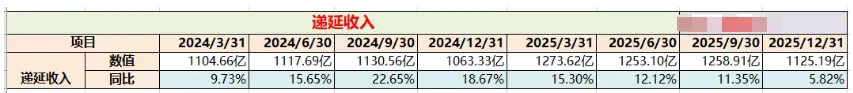 截至2025年12月底递延收入为1125.19亿,同比增长5.82%。
