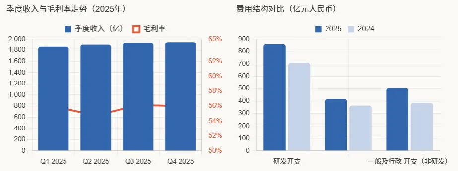 2025年全年毛利率56%,较上年提升3个百分点,这是相当可观的改善。高毛利率收入(自研游戏、视频号及微信搜一搜广告、AI云服务)占比持续扩大,是核心驱动力。