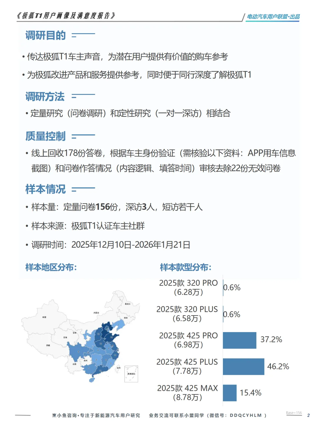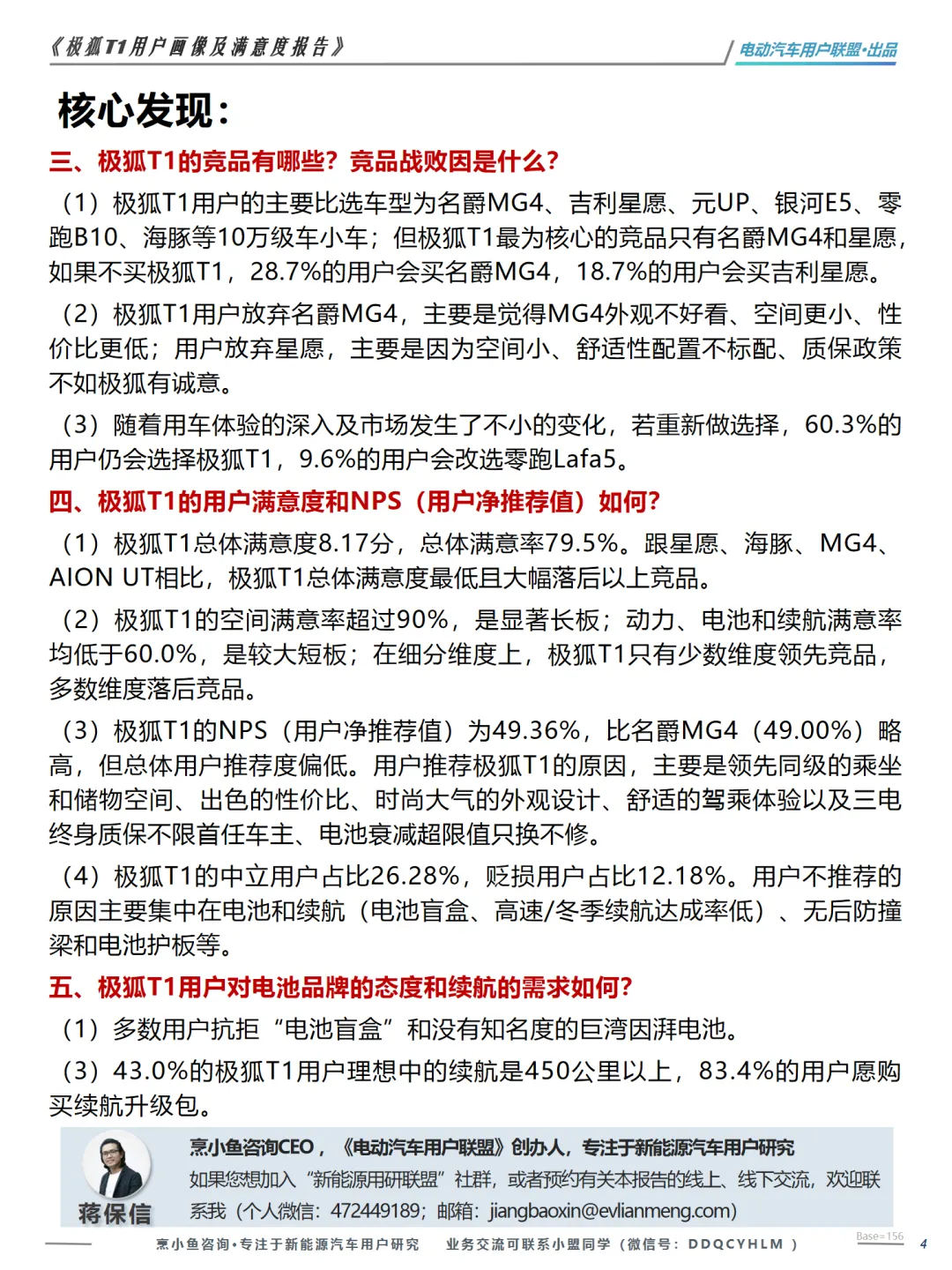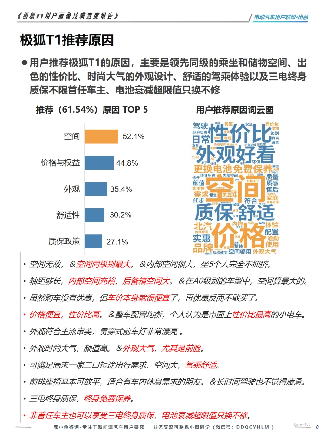综上所述,极狐T1的用户群体是一群理性务实、精打细算的普通工薪族,他们在选择车辆时更注重实用性和性价比。极狐T1以其合理的定价、宽敞的空间和时尚的外观,成功地吸引了这一群体。尽管存在一些顾虑和不满意之处,但极狐T1在满足用户核心需求方面做得相当不错,这也反映在用户对其的正面评价和较高的满意度上。