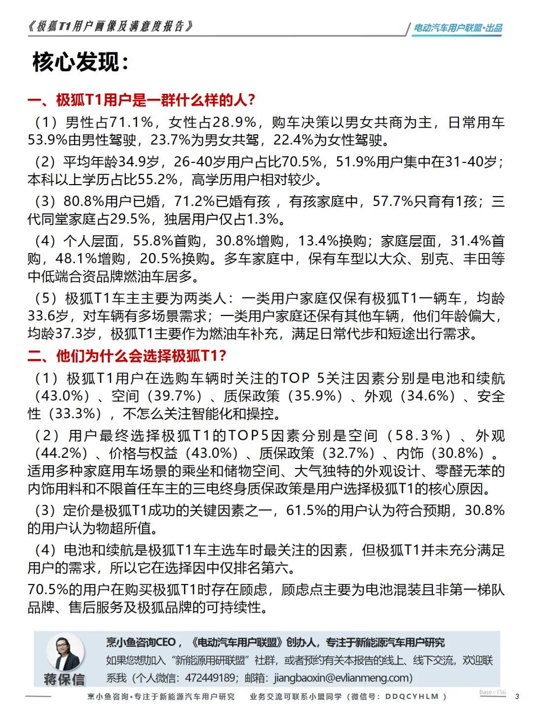 在用车场景上,极狐T1的用户主要将其用于日常代步和短途自驾游,这与他们的生活状态和家庭需求相符合。他们需要一辆既能够满足上下班通勤,又能在周末和节假日满足家庭出游需求的车辆。因此,极狐T1的紧凑型车身和适中的续航能力正好满足了这些需求。