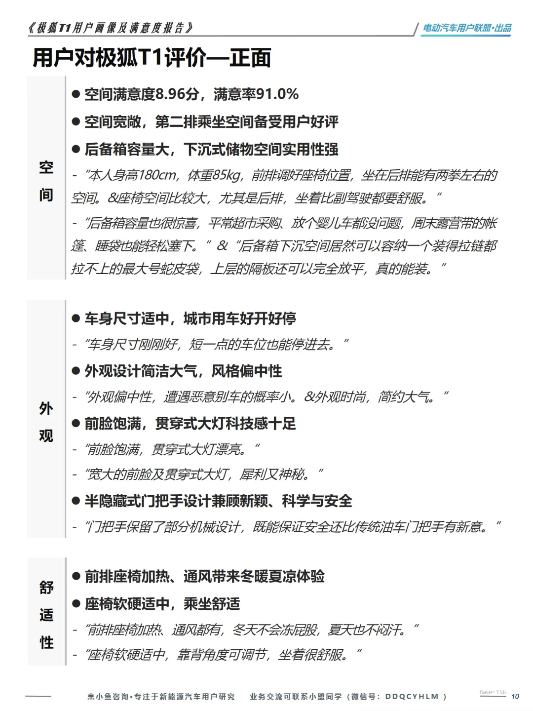 用户对极狐T1的满意度总体上是积极的。他们对车辆的空间、外观、价格和权益、质保政策等方面给予了高度评价。特别是空间方面,用户对其宽敞的乘坐空间和后备箱容量感到满意。此外,极狐T1的外观设计也受到了用户的青睐,他们认为车辆时尚大气,颜值高。