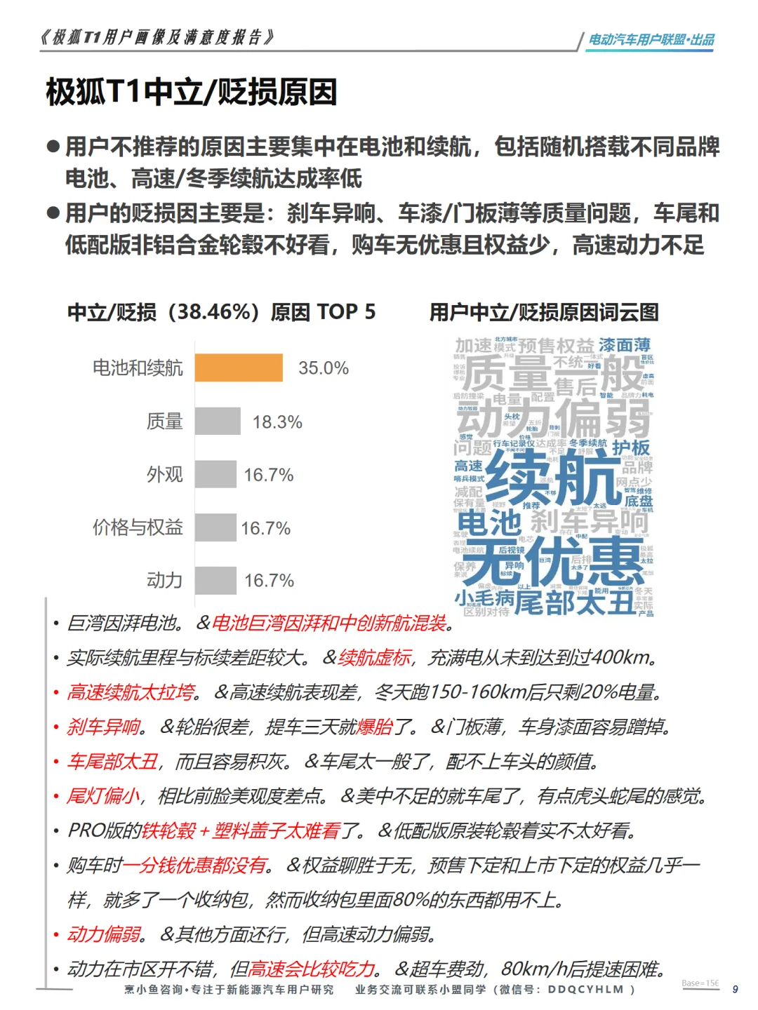 然而,报告也指出了一些用户的顾虑和不满意的地方。例如,一些用户对电池和续航能力表示担忧,尤其是电池混装和非第一梯队品牌的问题。此外,售后服务、品牌可持续性以及车辆的智能化和操控也是用户关注的焦点。