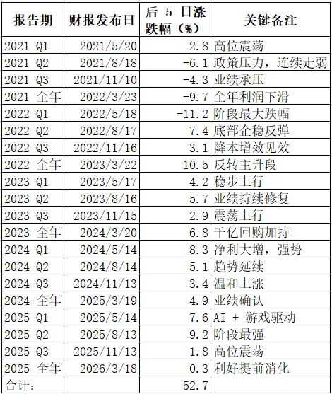 过去的一年发生了很多事情,三座大山压顶,总算扛住了没有倒下。停更一年,接下来有空就继续更新吧。生活还在继续,投资也不会停止,保持学习,保持思考,一切都会好起来的。 印象中,近几年腾讯的财报魔咒不断发生,简单说就是每次发布财报(不管是年报还是季报),业绩大涨,形式喜人,但接下来的股价却多数是下跌的。背后是什么原因呢?投资者对小企鹅的期望过高,导致产生预期差,最后用脚投票,先跑为敬? 本人持有腾讯股票多年,且为第一重仓,但我骨子里是深度价值投资者,对短期波动并不在意。昨晚睡前看了一眼腾讯美股ADR,下跌5%,然后就得出以上结论了。 事实是人的记忆总是不可靠的,还是要用数据说话。我让AI帮我将近5年,每次腾讯发布季报、年报后5个交易日股价涨跌情况,做了一张表: 好吧,数据证明直觉是错误的,除了2021Q2至2022Q1连续4个季度被A4纸抽得挺惨之外,其他季度公布财报后5个交易日都是上涨的,全部20次季报发布后5个交易日平均上涨2.6%多,涨得不少了。郑重声明:本公众号仅分享个人投资观点与感悟,所有提及的标的仅做案例分析用,文中内容不作为投资建议。投资有风险,入市需谨慎。投资者应保持独立思考。