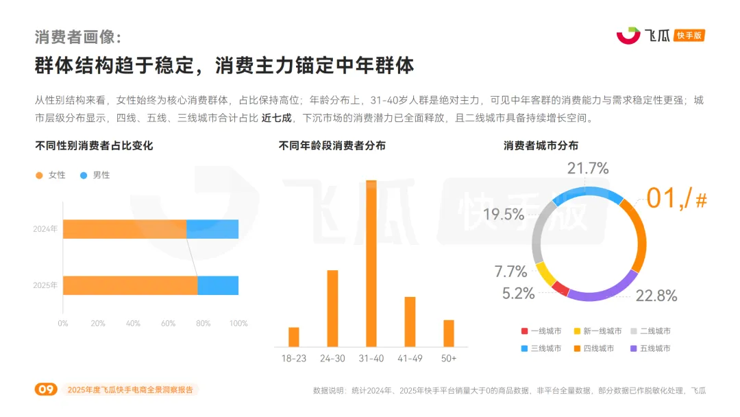 首先,快手电商的GMV持续增长,显示出平台销售热度的稳步提升。特别是在重要的营销节点如618和双11期间,销售均价和推广规模双双增长,反映出平台电商生态的活力。此外,消费者画像显示,中年群体成为消费主力,其中31-40岁人群占比最高,而下沉市场的消费潜力得到了全面释放。