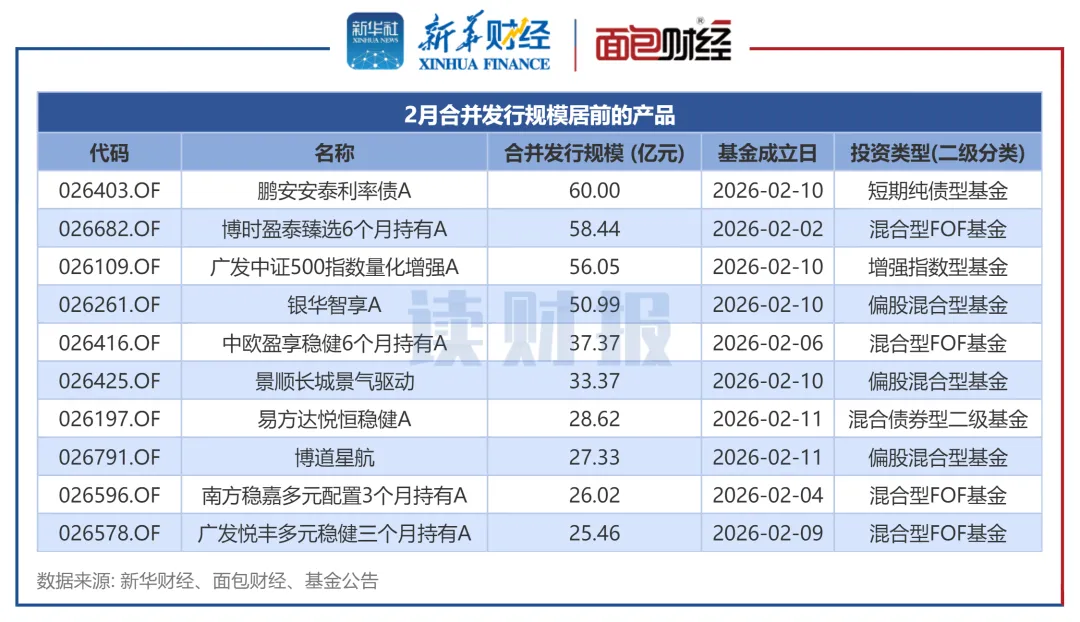 具体来看,2月合并发行规模最大的产品为鹏安安泰利率债。该基金于2月11日发布公告称,基金有效认购户数为268户,基金合同于2月10日正式生效。该基金类型为短期纯债型基金,基金经理为孙晨歌、蔡宇飞,合并发行规模为60亿元。
