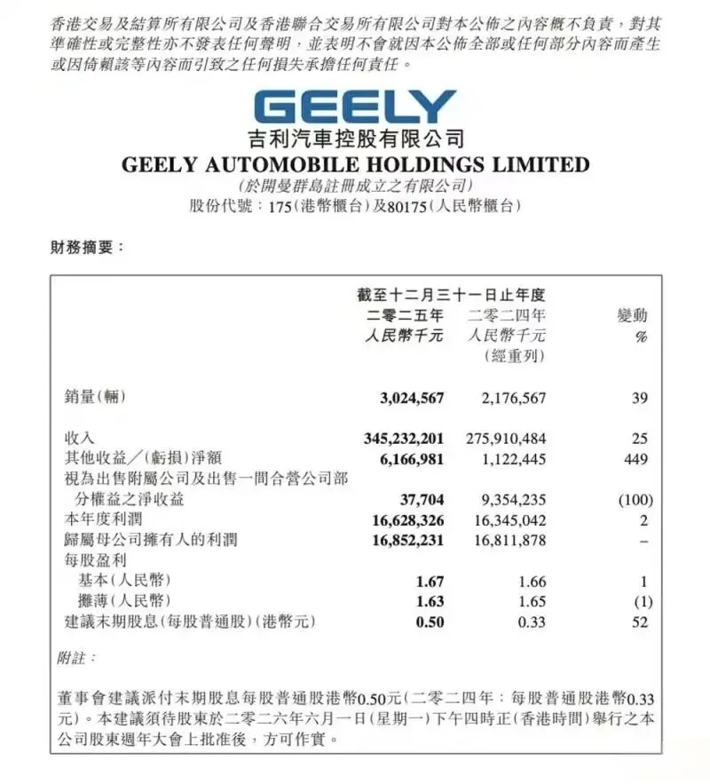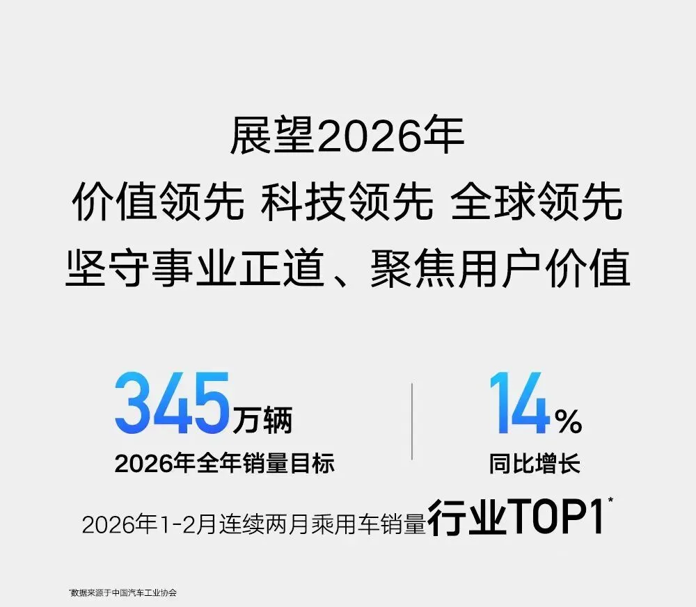 财报同时披露,2026年公司将冲击345万辆销量目标,持续深耕智能电动化与全球化领域。