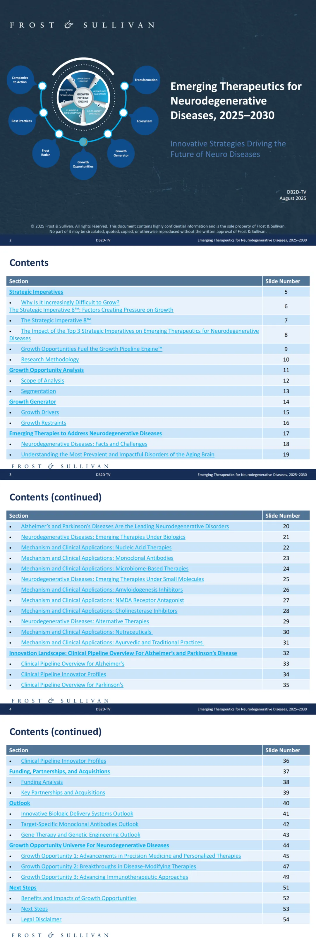 这份由 Frost & Sullivan 发布的《2025-2030全球神经退行性疾病新兴疗法》报告,聚焦阿尔茨海默病、帕金森病等主流神经退行性疾病,分析了其治疗领域的发展现状、新兴疗法、增长驱动与制约因素、临床管线、投融资及未来增长机遇,核心指向疾病修饰疗法研发、精准医疗落地、创新递送技术突破是该领域 2025-2030 年的核心发展方向,同时指出行业仍面临研发成本高、病理机制认知不足等挑战。以下是核心内容总结: