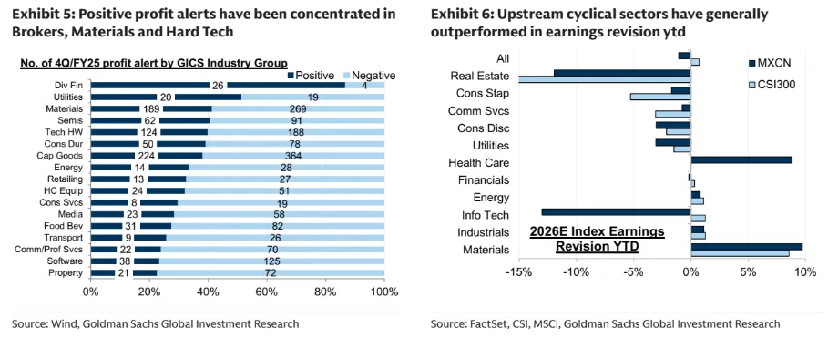 A股动能持续更强,我们预计其盈利增长将连续第四个季度跑赢H股(4Q25预测:A股+11%,H股-5%)。这一趋势主要由上游行业的盈利预期上修推动;过去六个月中,CSI300在2025及2026年的一致预期盈利上调了3%,显著优于自4Q25以来MSCI中国-1%的调整。