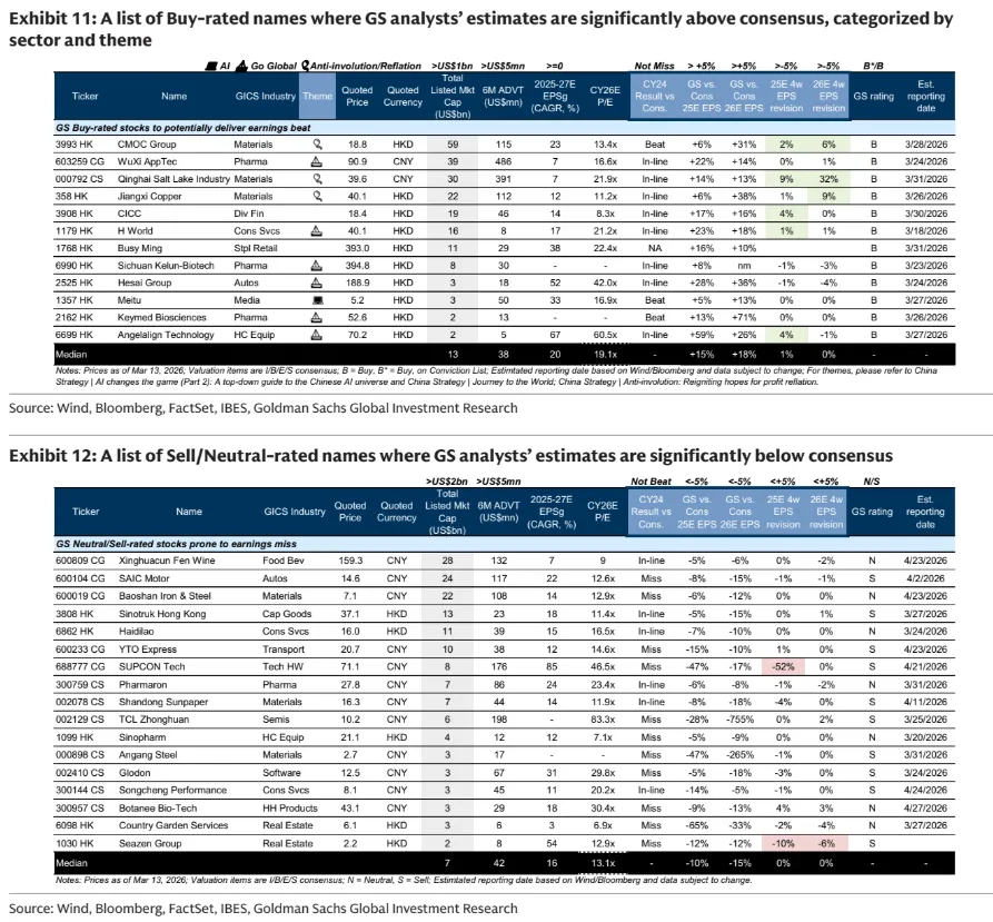 我们通过筛选获得“买入”评级且分析师预测显著高于一致预期、并且过去一个月盈利修正趋势保持中性或正向的公司,来识别潜在业绩超预期的标的。这些标的大多契合三大核心战略主题——AI、反内卷/再通胀,以及“出海”——这些主题是推动指数每股收益(EPS)增速提升至低双位数的主要驱动力。与此同时,我们也筛选潜在业绩不及预期的公司,为多空投资策略提供可操作的洞见。