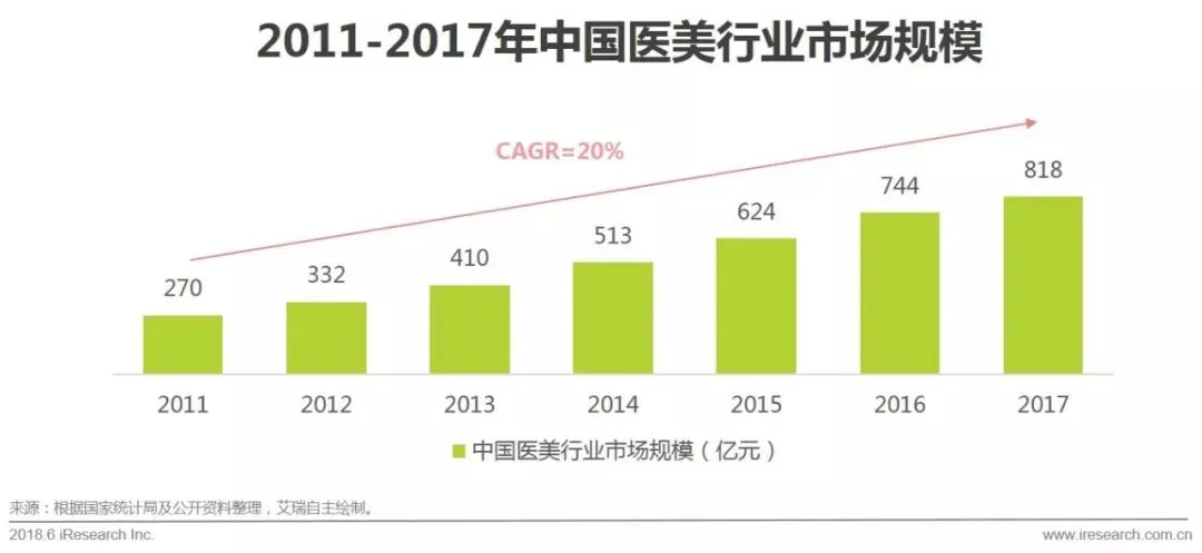 随着经济的发展,国民可支配收入正在稳健提升,2018年国民可支配收入将达到28,614元;国民可支配收入的提升带来人们对更多品类的消费升级。随着90后,00后逐渐登上社会的舞台,颜值消费成为消费升级下的一大重要分支。自2011年起,我国整体医疗美容行业的市场规模逐年攀升,到2017年复合增长率达到20%。
