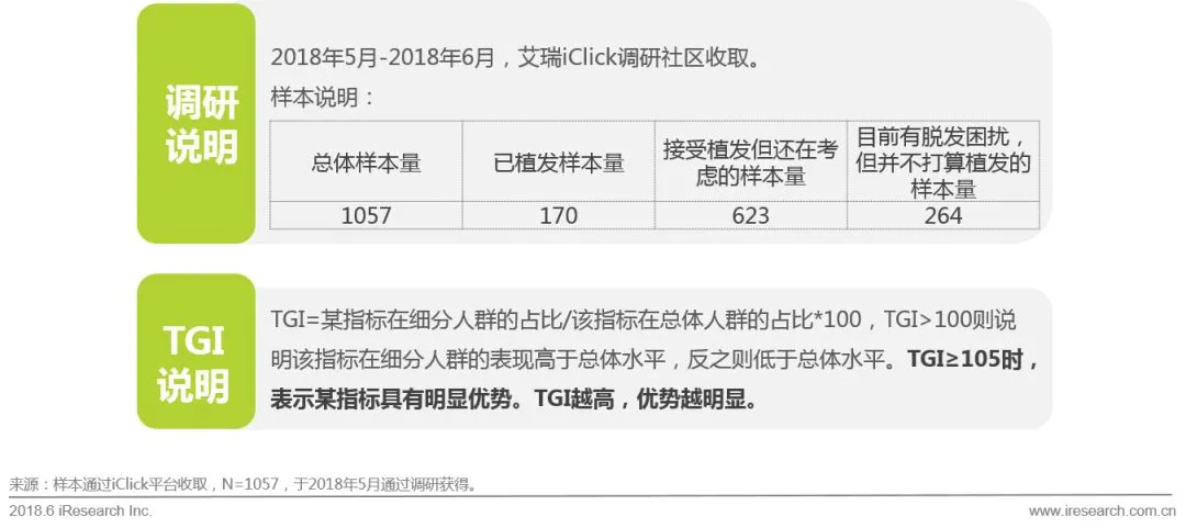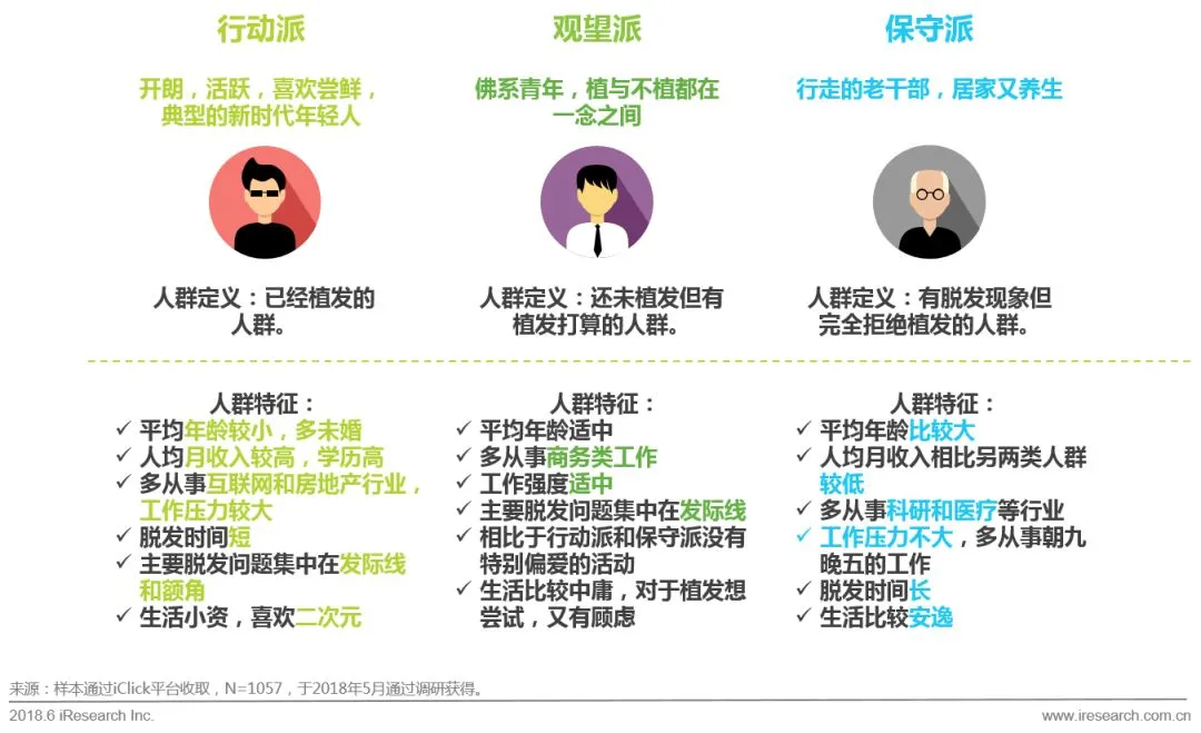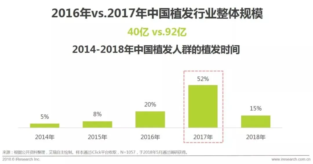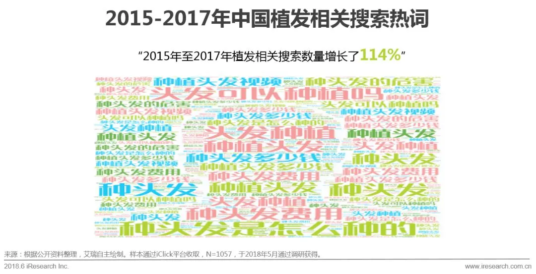 通过百度搜索的数据,2015年到2017年,植发相关的搜索数量增长了114%;用户植发的时间也主要集中在2016年和2017年。在2016年,植发用户数量已经有小的攀升,到2017年,植发用户呈现了爆炸式的增长。主要有以下原因: