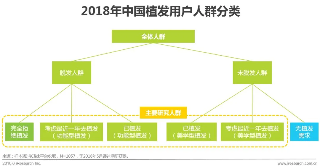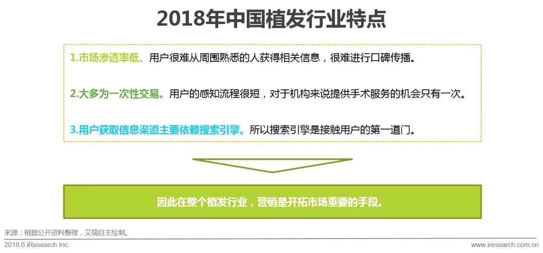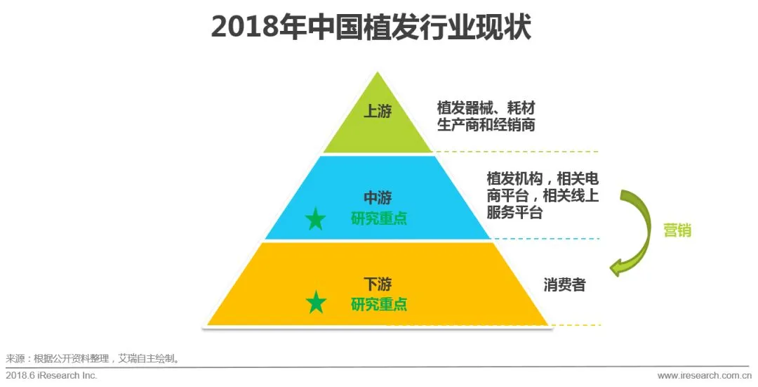 植发行业上游包括相关医疗器械,耗材以及经销商,中游包括植发机构,作为消费者的购买入口的相关的电商平台以及相关的线上服务平台,下游主要是消费者。此次报告的研究重点集中在植发机构的营销活动以及消费者行为上。根据植发手术的特点,可以看出,植发机构的传播主要依赖营销。