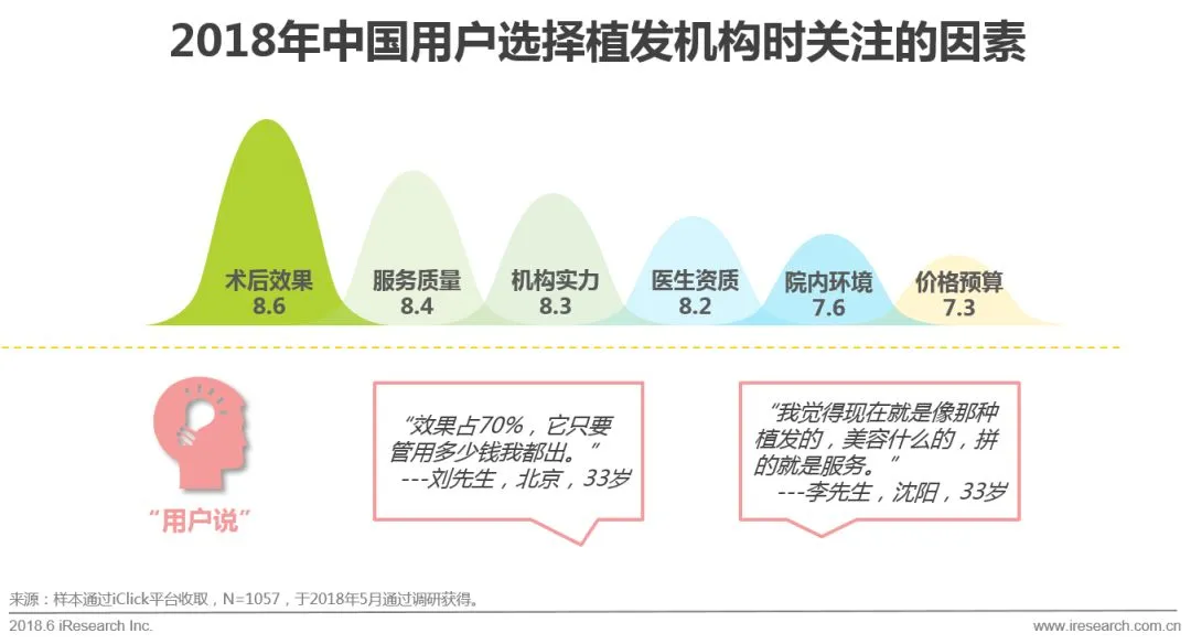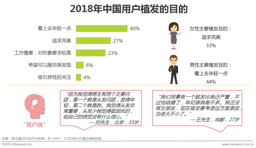 2017年植发用户呈现爆炸式增长,我国植发用户在年龄上普遍年轻化,已植发人群平均年龄34岁,其中女性占41%,为追求完美的艺术类植发用户不在少数。除遗传性原因外,饮食习惯、生活习惯、环境气候、精神压力等成为导致脱发的原因。在植发机构的选择上,要以专业、规范为侧重点,选择大型全国连锁机构如雍禾植发,对术后效果更有保障。