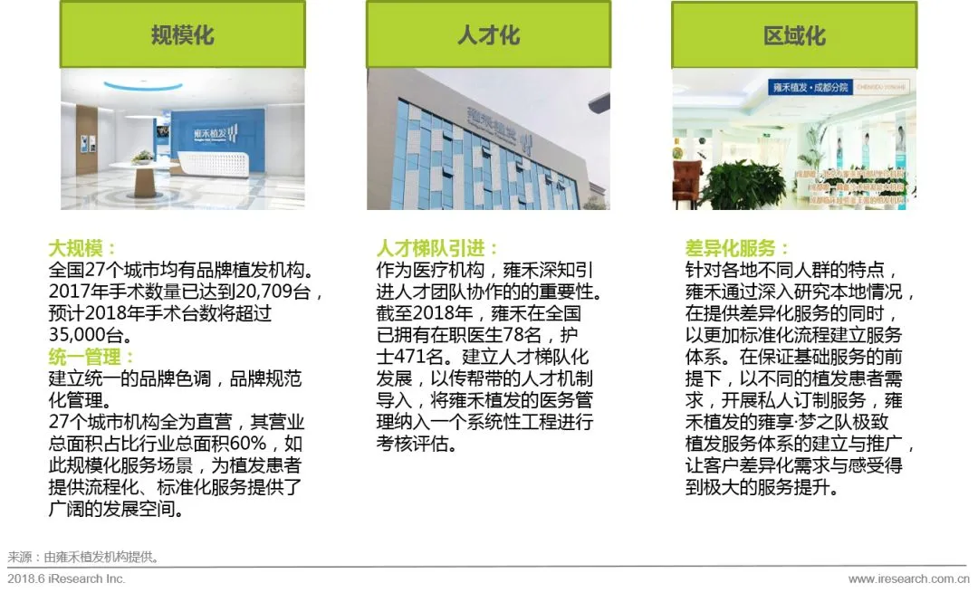 2)发展期:整个行业规模逐渐扩大,出现少数形成规模的企业,很多小型企业如雨后春笋,同时很多医疗美容综合机构开设植发科。产业链逐渐丰富,连锁机构需要提升品牌知名度,需要进行营销活动。在监管上,国家逐渐完善监管机制,虽然仍存在大量“小作坊”的三无企业,但行业整体日渐规范。目前整体植发行业处在发展期到成熟期的转型,大型连锁机构竞争激烈,各机构均加大了营销的投入,所以最近两年是各机构占领市场的关键时间点,基本会奠定未来3-5年整个植发行业的格局。