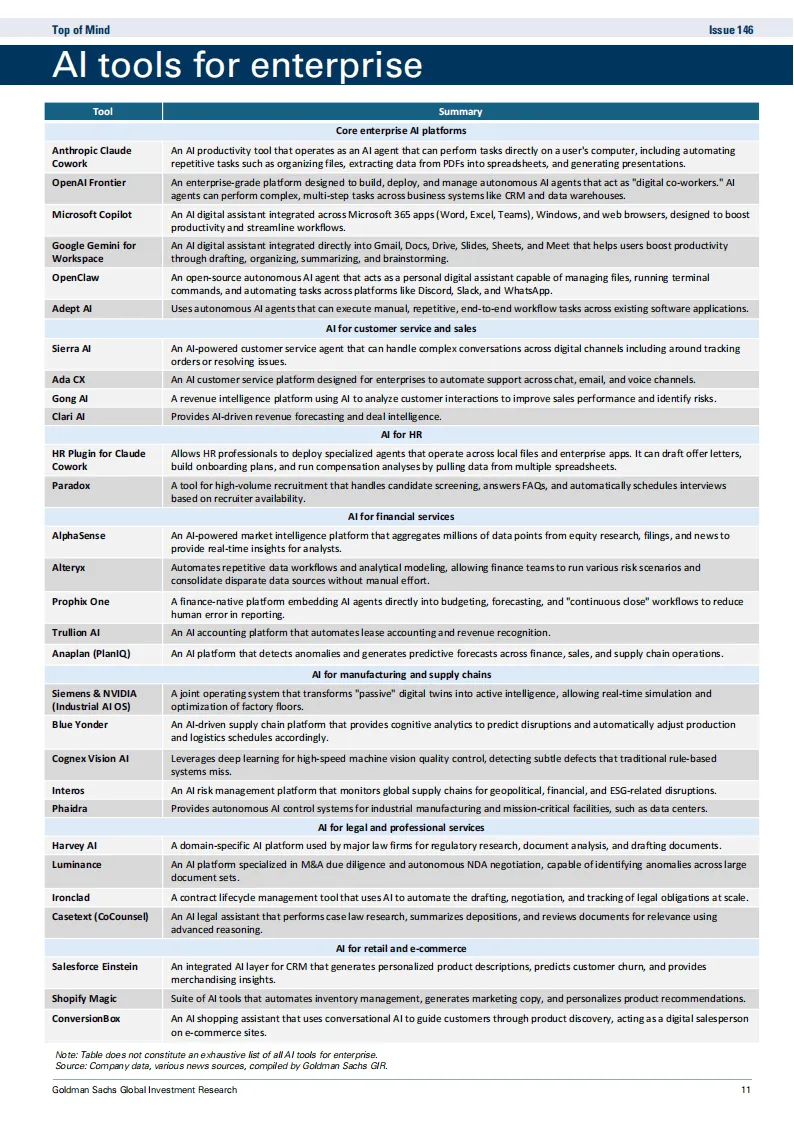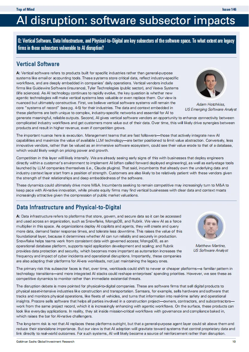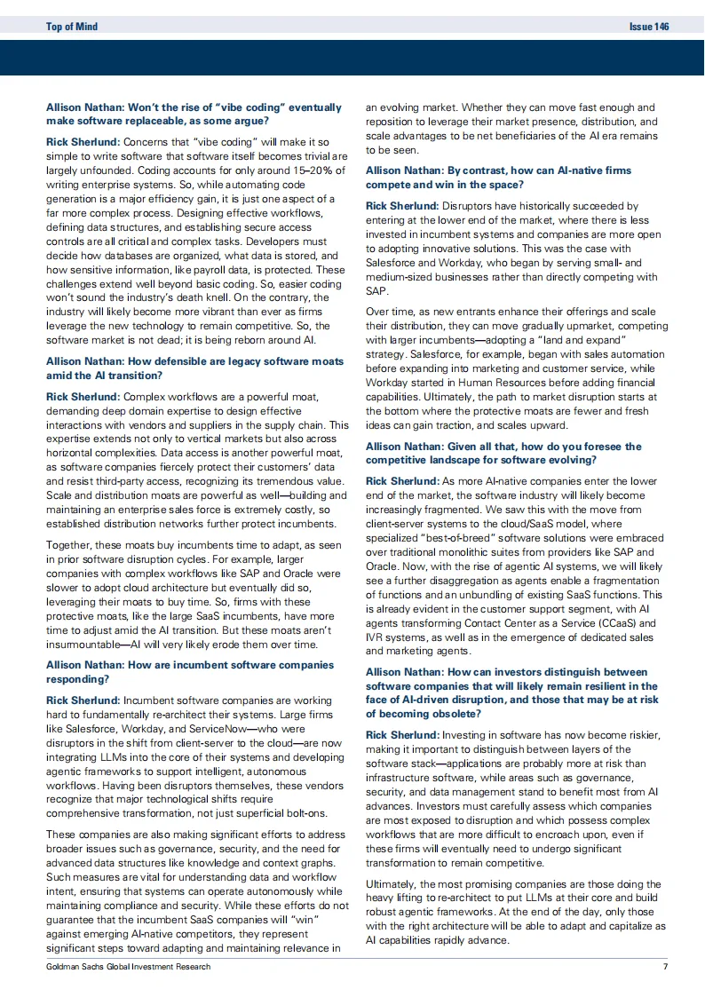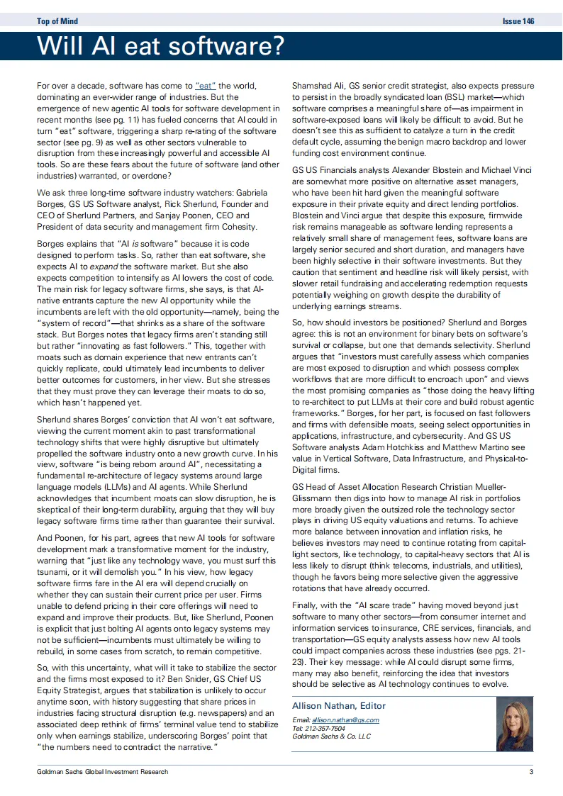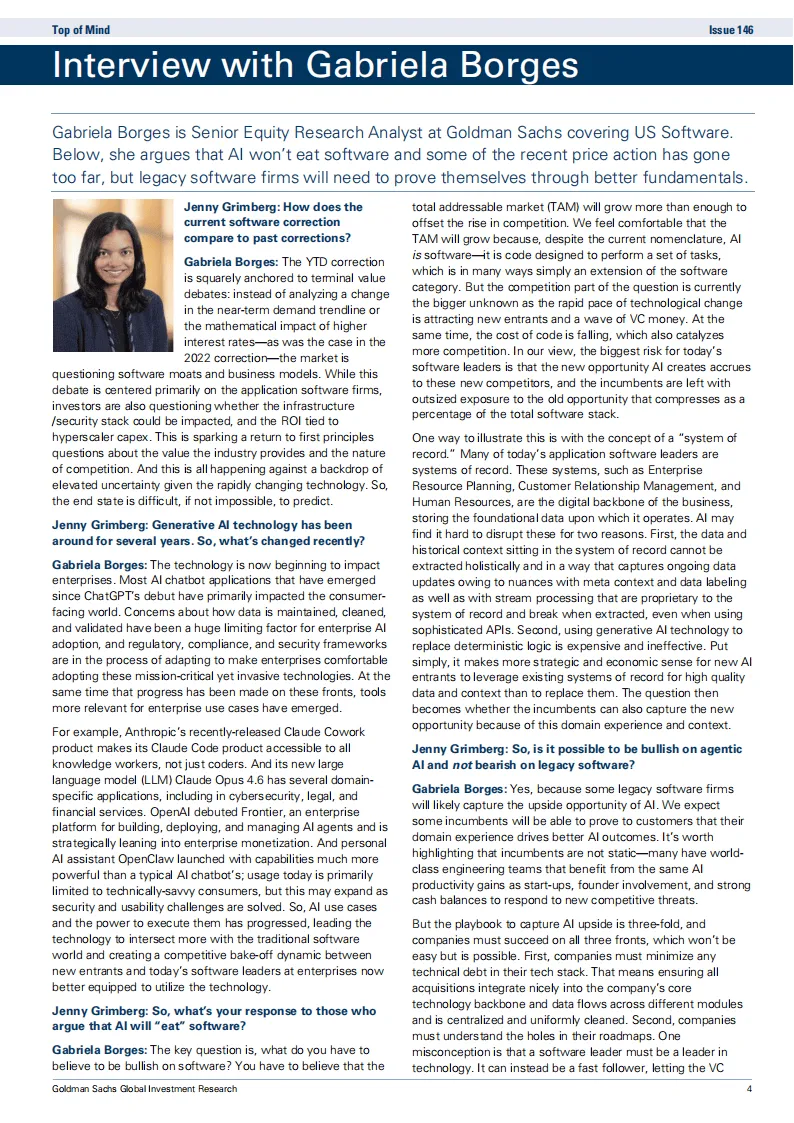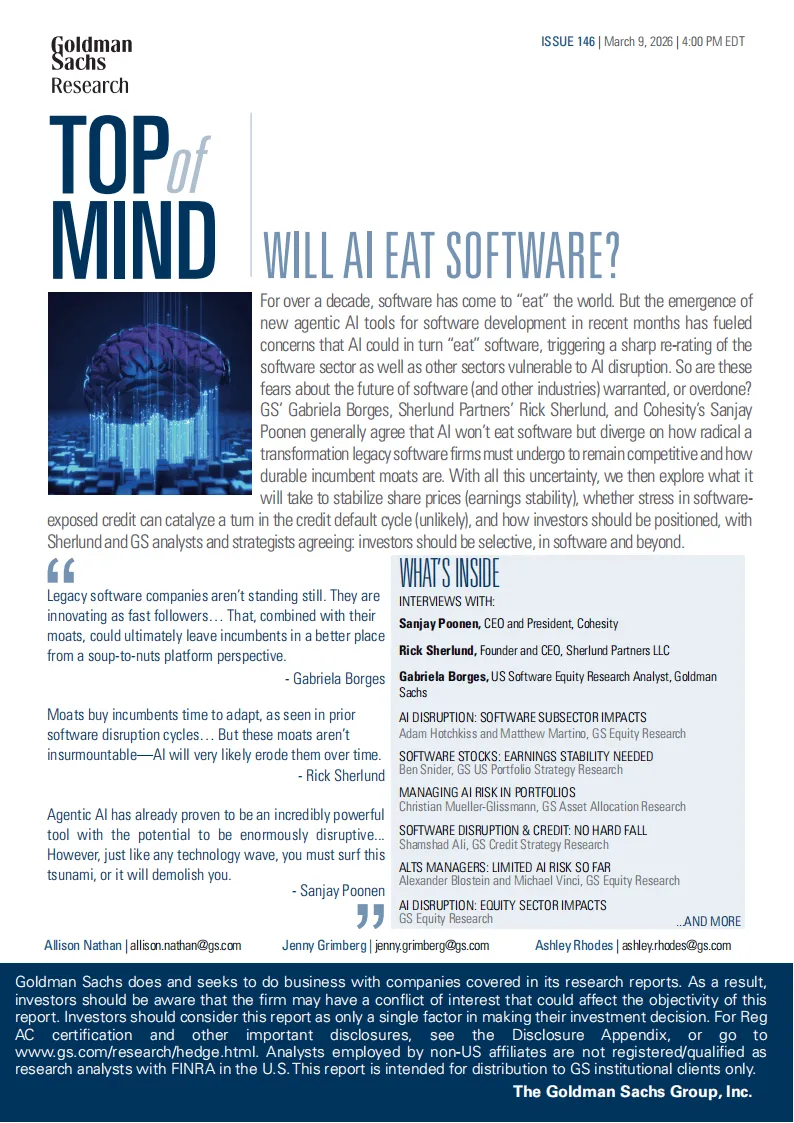 高盛2026年3月发布的焦点洞察报告围绕“AI是否会取代软件”展开深度分析,核心结论为AI不会吞噬软件行业,反而将推动其转型与扩容,但传统软件企业需完成深度架构重塑才能保持竞争力,行业整体将迎来结构性变革。