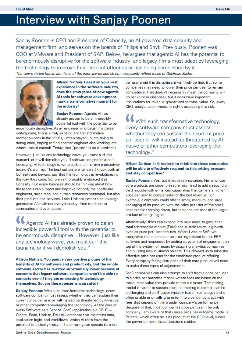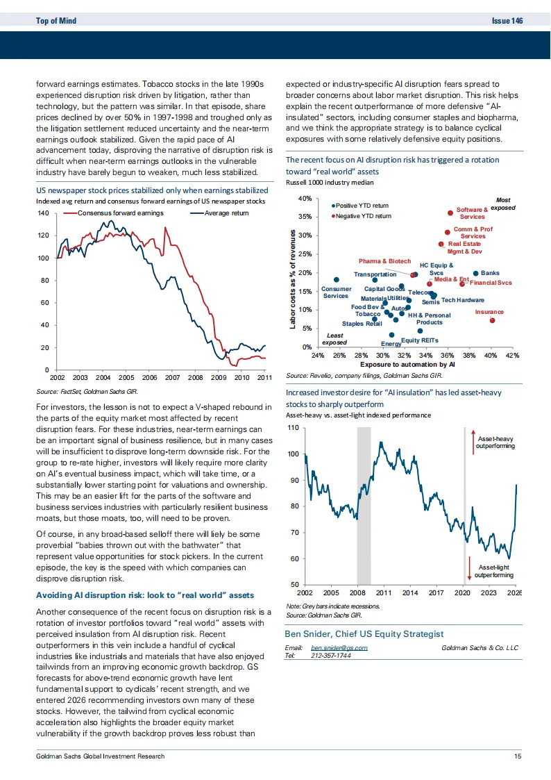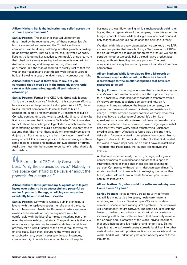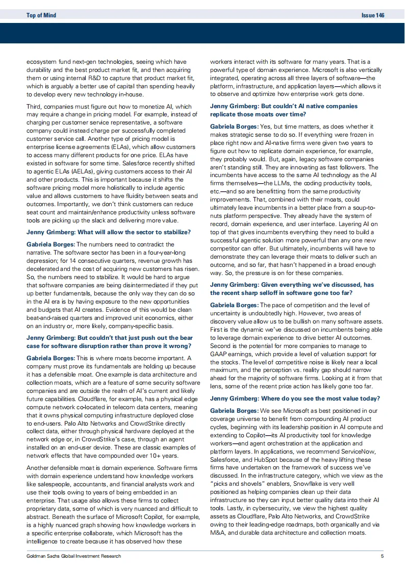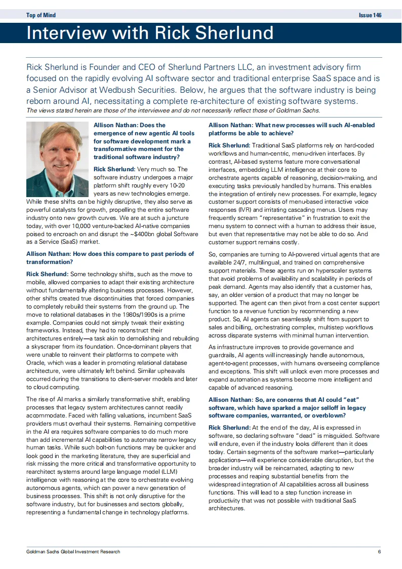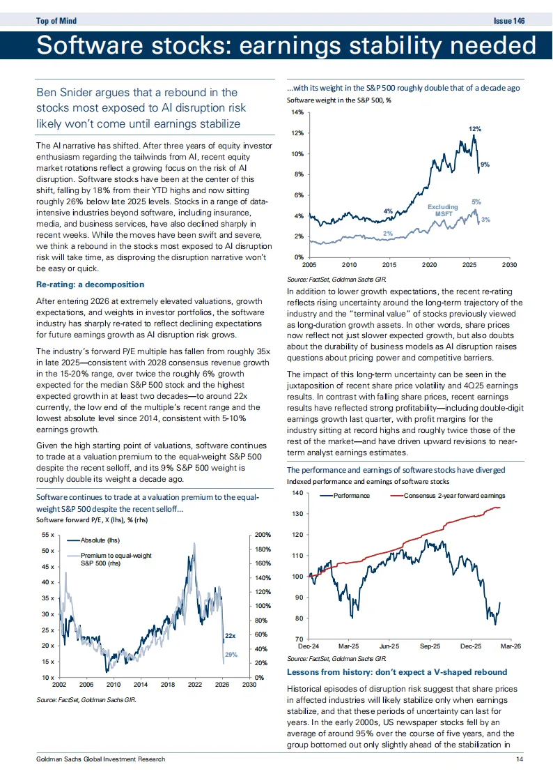 高盛2026年3月发布的焦点洞察报告围绕“AI是否会取代软件”展开深度分析,核心结论为AI不会吞噬软件行业,反而将推动其转型与扩容,但传统软件企业需完成深度架构重塑才能保持竞争力,行业整体将迎来结构性变革。