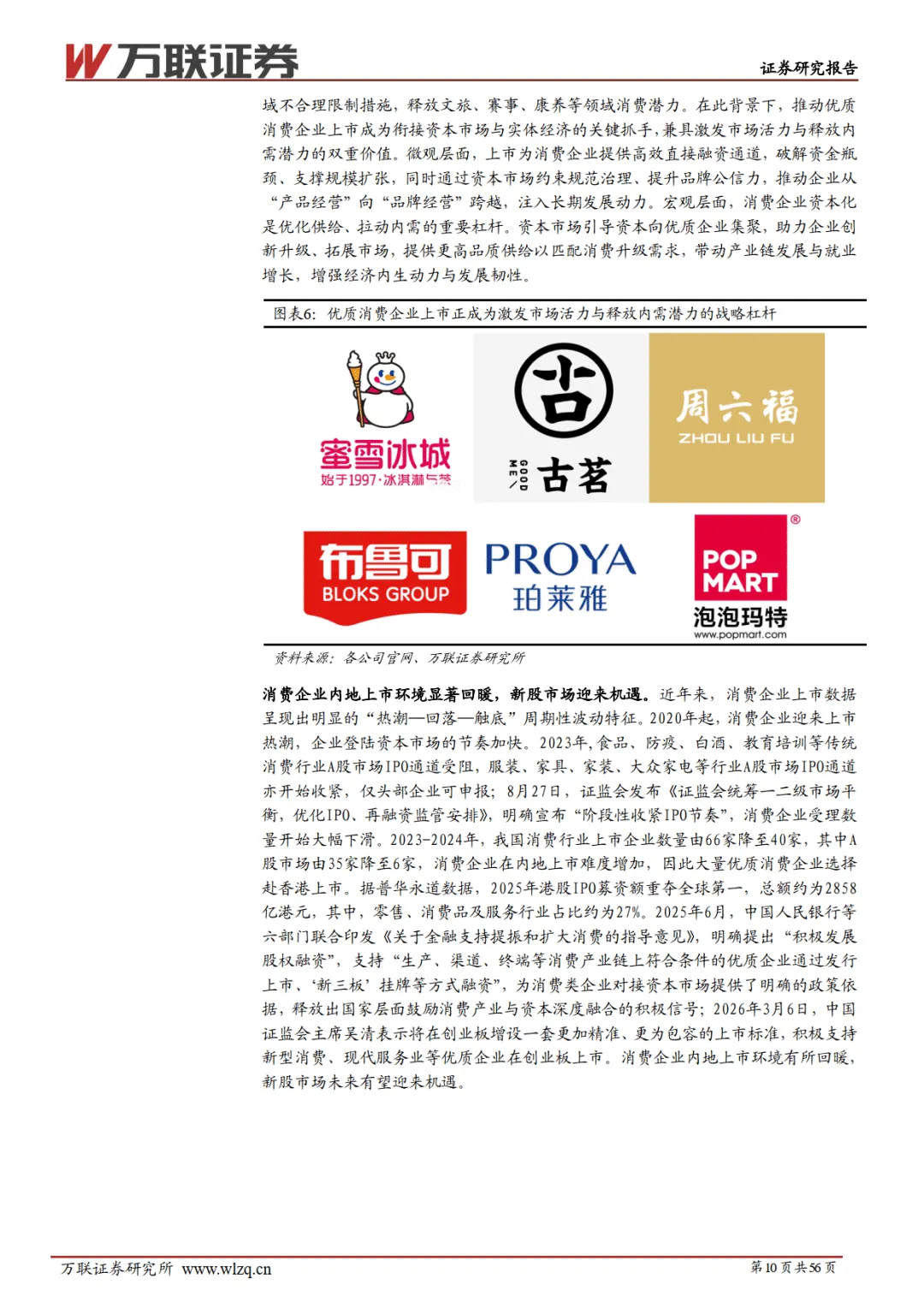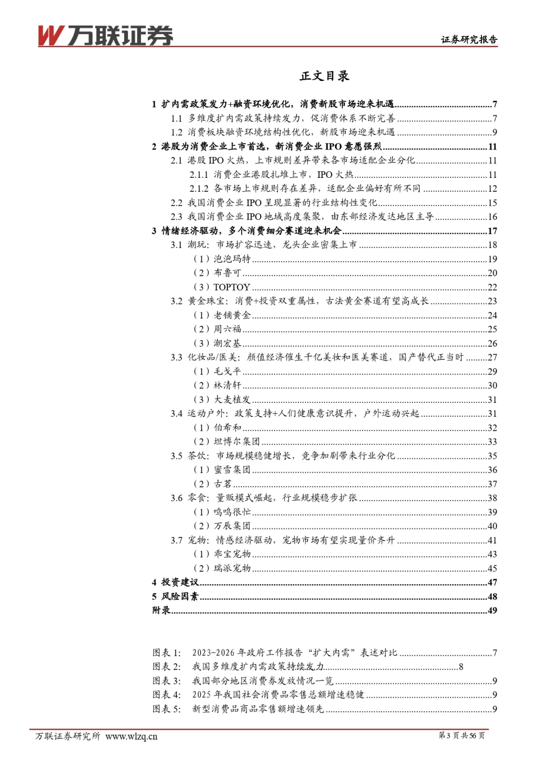 2026 年 3 月万联证券发布的消费行业新股专题报告指出,在扩内需政策持续发力、消费板块融资环境优化的背景下,叠加情绪经济崛起,消费新股市场迎来发展机遇,港股成消费企业上市首选,潮玩、黄金珠宝等七大新消费细分赛道具备较高投资价值,同时需警惕流动性、政策等多重风险。————