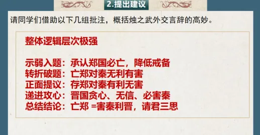 任务二(究其言):重点探究劝说秦伯的外交辞令。通过批注、小组讨论,分析其说理的层次(五步)与高妙之处(四点),并揣摩秦伯的心理变化。