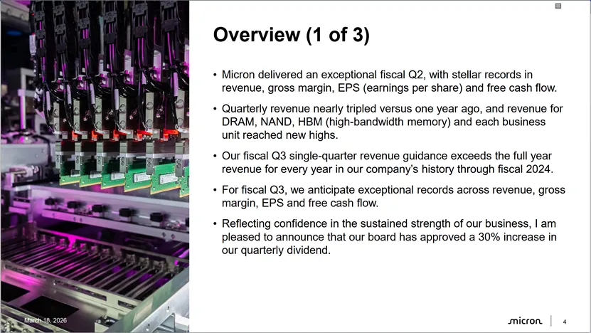 美光 2026 财年第二季度业绩表现亮眼,营收、毛利率、每股收益及自由现金流均创下历史新高。本季度营收较去年同期近乎三倍增长,动态随机存取存储器(DRAM)、闪存(NAND)、高带宽存储器(HBM)各产品线及各业务单元营收均刷新纪录。公司 2026 财年第三季度单季营收指引,已超过美光 2024 财年及此前所有财年的全年营收。我们预计,2026 财年第三季度公司营收、毛利率、每股收益和自由现金流各项指标将再创历史佳绩。基于对公司业务持续强劲发展的信心,我很高兴宣布,公司董事会已批准将季度股息上调 30%。