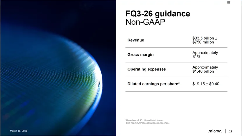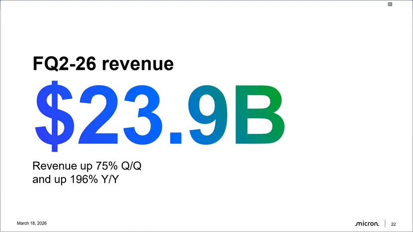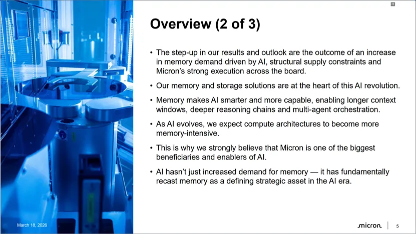 公司业绩与业绩展望实现跨越式提升,核心得益于人工智能驱动下存储器需求激增、行业结构性供应短缺,以及美光全方面的出色运营表现。我们的存储与记忆解决方案是这场人工智能革命的核心所在。存储器让人工智能更智能、更强大,助力实现更长的上下文窗口、更深度的推理链以及多智能体协同调度。随着人工智能技术的不断演进,我们预计计算架构对存储器的依赖度将持续提升。正因如此,我们坚信,美光将成为