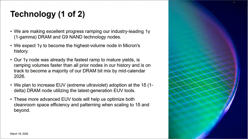 我们预计,1γ 代将成为美光历史上出货量最高的工艺节点。该节点不仅是美光实现良率稳定速度最快的工艺,产能爬坡速度也远超公司过往所有节点,按计划将于 2026 年年中成为美光 DRAM 芯片出货的主流工艺。针对 1δ 代 DRAM 工艺节点,我们计划采用最新一代极紫外光刻(EUV)设备,提升该技术的应用比例。这些更先进的极紫外光刻设备,将助力我们在 1δ 代及后续更先进工艺的研发中,优化洁净室空间利用率与光刻图案制程。
