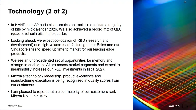 展望未来,我们计划将博伊西和新加坡研发中心与高产能制造基地进行一体化布局,加快前沿产品的上市速度。我们看到,存储器和存储解决方案在各市场领域赋能人工智能时代的机遇前所未有,因此计划在 2027 财年大幅增加研发投入。