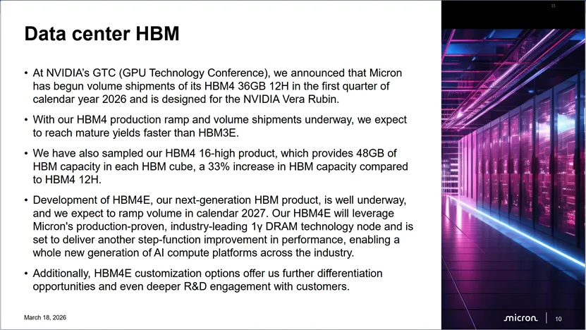 公司下一代 HBM 产品 HBM4E 的研发工作进展顺利,计划于 2027 年实现量产爬坡。HBM4E 将采用美光经量产验证的行业领先 1γ 代 DRAM 工艺,性能将实现跨越式提升,为全行业新一代人工智能计算平台提供支撑。此外,HBM4E 的定制化选项将为我们打造差异化竞争优势,并推动与客户开展更深度的研发合作。
