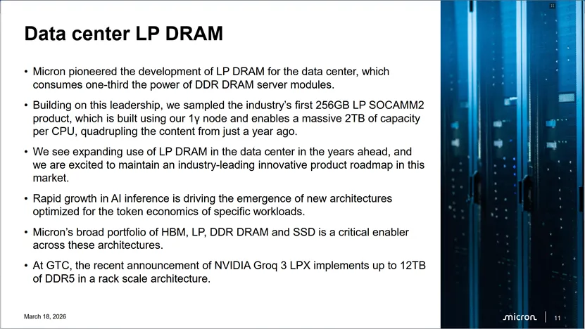美光是数据中心低功耗 DRAM 的开创者,其功耗仅为 DDR DRAM 服务器模组的三分之一。依托这一领先优势,我们推出了行业首款基于 1γ 代工艺的 256GB 低功耗 SOCAMM2 产品,每颗中央处理器(CPU)可支持高达 2TB 的存储容量,相较一年前提升三倍。我们预计,未来低功耗 DRAM 在数据中心领域的应用将持续拓展,公司也将继续在该市场保持行业领先的产品创新路线图。