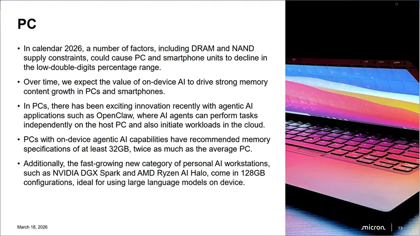 个人电脑领域近期创新成果频出,OpenClaw 等智能体人工智能应用相继落地,这类应用可在本地电脑端独立完成任务,也可向云端发起工作负载。搭载终端侧智能体人工智能功能的个人电脑,建议存储器配置至少为 32GB,是普通电脑的两倍。此外,个人人工智能工作站这一新兴品类增长迅猛,英伟达 DGX Spark、AMD 锐龙 AI Halo 等产品均配备 128GB 存储器,非常适合在本地运行大语言模型。