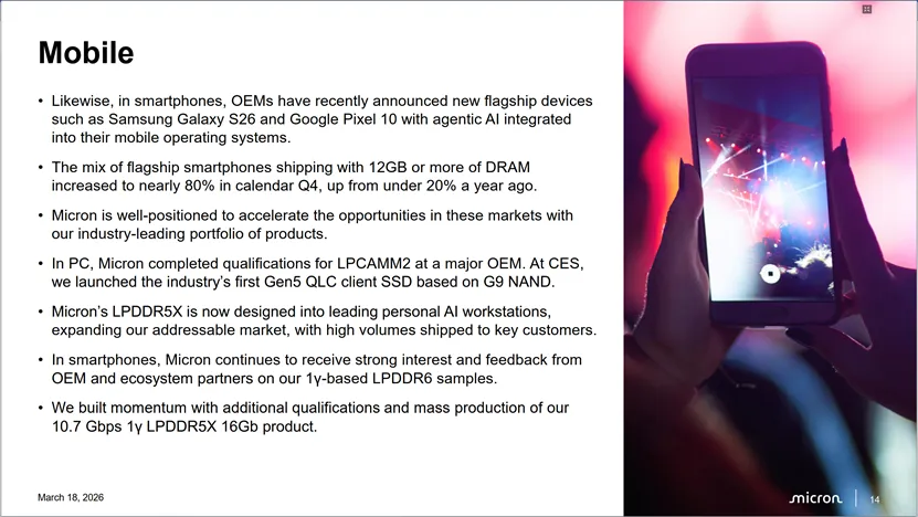 依托行业领先的产品组合,美光已做好充分准备,把握个人电脑与移动终端市场的增长机遇。在个人电脑领域,美光已完成某头部厂商低功耗 CAMM2 产品的认证工作;在国际消费电子展(CES)上,我们发布了行业首款基于 9 代 NAND 工艺的第五代消费级 QLC 固态硬盘。美光的 LPDDR5X 产品已被多款主流个人人工智能工作站采用,公司的目标市场得以拓展,目前已向核心客户实现高产能出货。在智能手机领域,基于 1γ 代工艺的 LPDDR6 样品已获得终端厂商及生态合作伙伴的高度关注与积极反馈;同时,10.7 Gbps 1γ 代 LPDDR5X 16Gb 产品的认证工作持续推进,并已实现量产,市场势头不断提升。