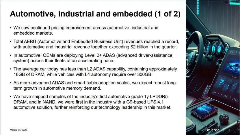 汽车领域,整车厂商正加速在全系车型中部署 L2 + 级高级驾驶辅助系统(ADAS)。目前,市面上主流车型的驾驶辅助系统尚未达到 L2 级,每辆车的 DRAM 搭载量约为 16GB;而具备 L4 级自动驾驶能力的车辆,DRAM 搭载量需超过 300GB。随着更高级别驾驶辅助系统与智能座舱的普及,我们预计汽车存储器市场需求将迎来长期强劲增长。美光推出了行业首款车规级 1γ 代 LPDDR5 DRAM 样品,同时也是业内首家推出基于 9 代工艺的车规级 UFS 4.1 NAND 解决方案的企业,进一步巩固了在汽车存储器市场的技术领先地位。