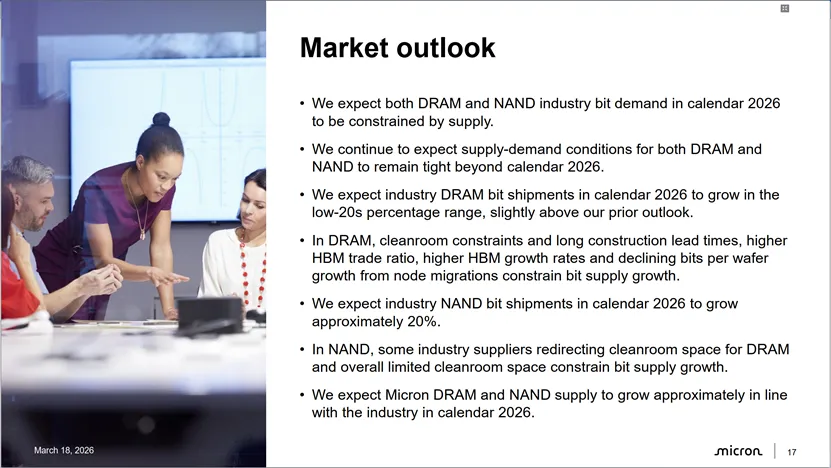美光预计,2026 年公司 DRAM 和 NAND 芯片的供应增长将与行业平均水平基本持平。