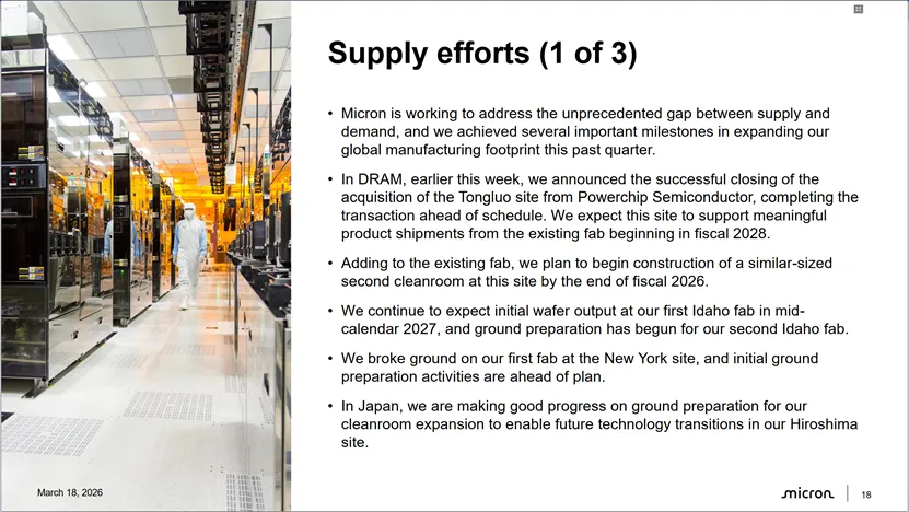 在 DRAM 领域,本周早些时候,美光宣布已提前完成对力晶科技铜锣厂区的收购。我们预计,该厂区现有的晶圆厂将于 2028 财年开始实现可观的产品出货。除现有产线外,公司计划于 2026 财年末在该厂区开工建设一座规模相当的第二座洁净室。