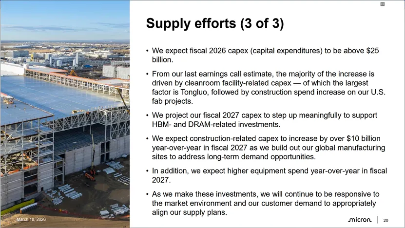 公司预计 2026 财年资本支出将超过 250 亿美元,相较上一次财报电话会议的预估,支出增长主要来自洁净室相关建设投入,其中铜锣厂区收购项目占比最大,美国晶圆厂建设成本增加次之。我们预计 2027 财年资本支出将大幅提升,以支撑 HBM 和 DRAM 相关的投资需求。2027 财年,为布局全球制造基地以把握长期市场需求机遇,公司建设相关资本支出将同比增加超 100 亿美元,设备采购支出也将同比增长。在进行上述投资的同时,公司将持续关注市场环境与客户需求,合理调整供应计划。