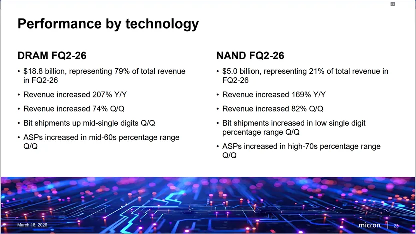 DRAM 业务营收创下 188 亿美元的历史新高,同比增长 207%,占公司总营收的 79%,环比增长 74%。芯片出货量实现中个位数增长;受行业供需紧张格局推动,叠加产品结构优化,产品均价实现 60% 出头的增长。