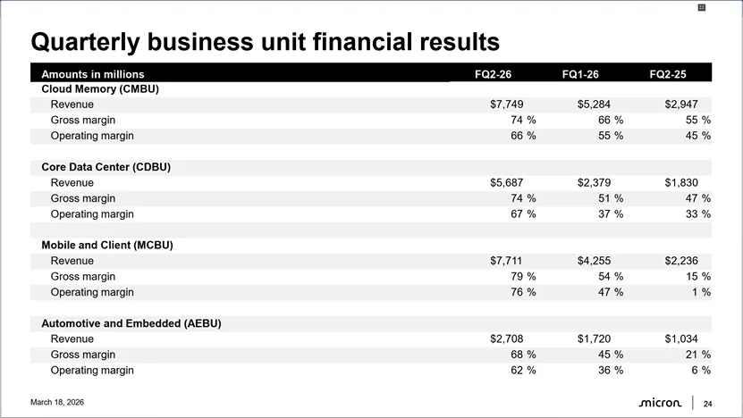移动与消费业务单元(MCBU)营收 77 亿美元,创历史新高,占公司总营收的 32%,营收环比增长 81%,增长动力为产品提价,出货量下滑部分抵消了这一增长;毛利率达 79%,环比提升 25 个百分点,主要得益于产品提价与结构优化。