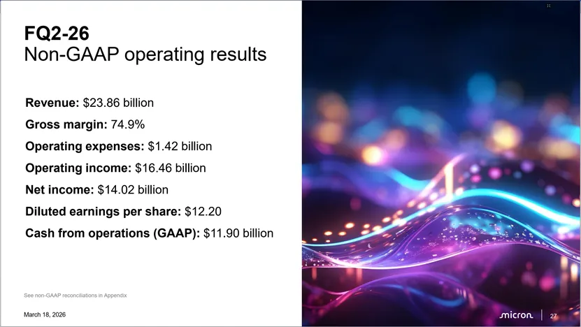 美光 2026 财年第二季度财务业绩表现强劲,营收、毛利率及每股收益均超出业绩指引上限。本季度公司自由现金流创下历史新高,债务规模进一步缩减,期末净现金余额刷新历史纪录。