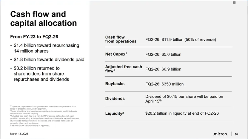 现金流与资本支出方面,2026 财年第二季度经营活动现金流为 119 亿美元,资本支出为 50 亿美元,实现自由现金流 69 亿美元,创下公司季度纪录,较 2026 财年第一季度的历史纪录增长 77%。